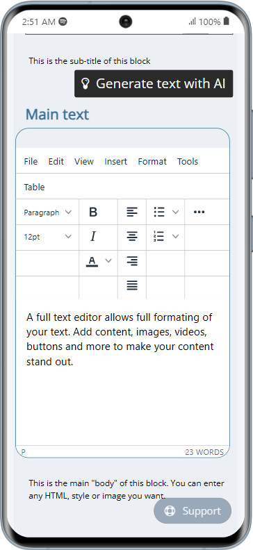 Full text editor, image upload or take selfy, video embed. image slider, buttons creator